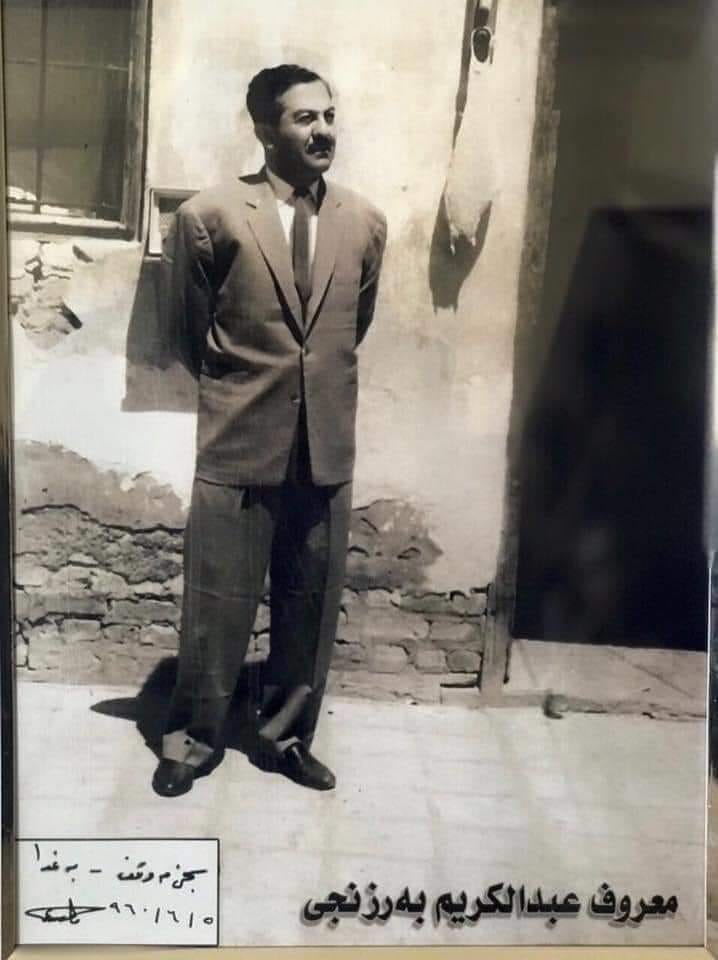 A picture of the martyr Marouf Abdul Karim Al-Barzanji during the events of Kirkuk in 1959, who was the mayor of Kirkuk. They presented him with his brother Sheikh Hussein and 26 others to the court that sentenced them to death. The sentence was not carried out against them during the rule of Abdul Karim Qasim, but after the coup of February 1963, the sentence was carried out against all of them. The photo is taken at Al-Mawqif Prison in 1960.