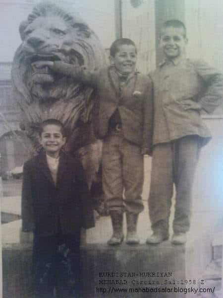 Three Kurdish children standing near the lion statue in Mahabad city center, 1958