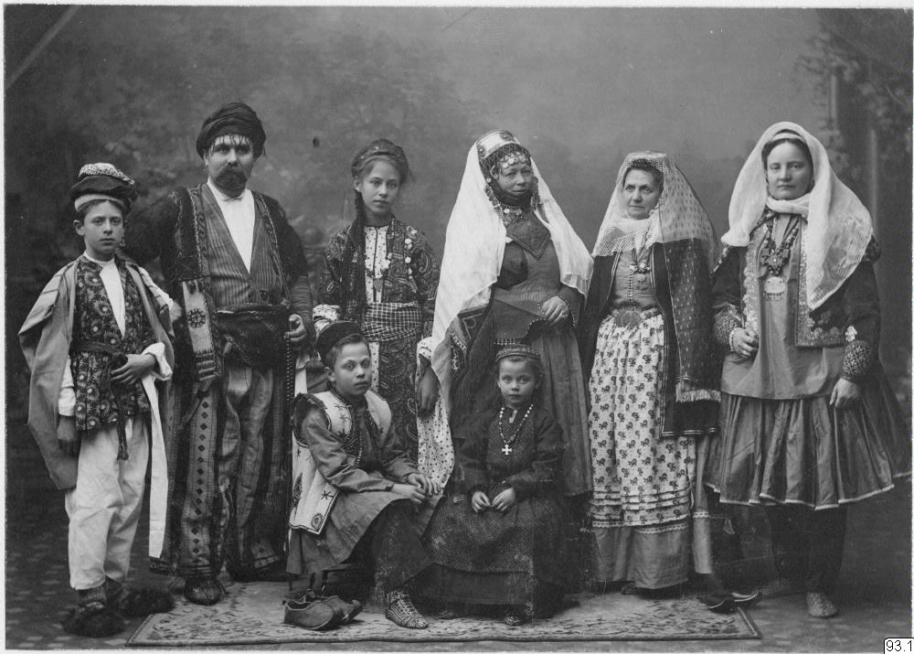 Group photograph of adults and children dressed in Armenian, Persian and Kurdish folk costumes