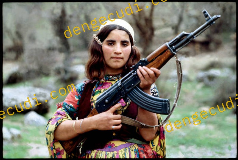 A Kurdish girl with her AK-47. Zagros Mountains, Kurdistan. 12th May 1979 by Alex Bowie